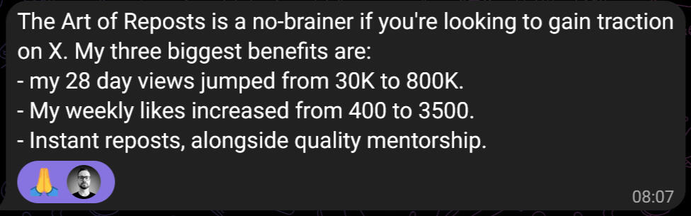 Donβt let another post go unnoticed.With "The Art of Reposts", youβre not just gaining followers.Youβre building a community and a brand that resonates deeply with your audience.Your dream π brand is within reach. Let's make it a reality, together.Mira, Aaron, Billy & Chris