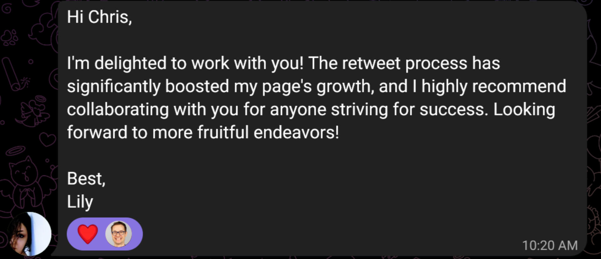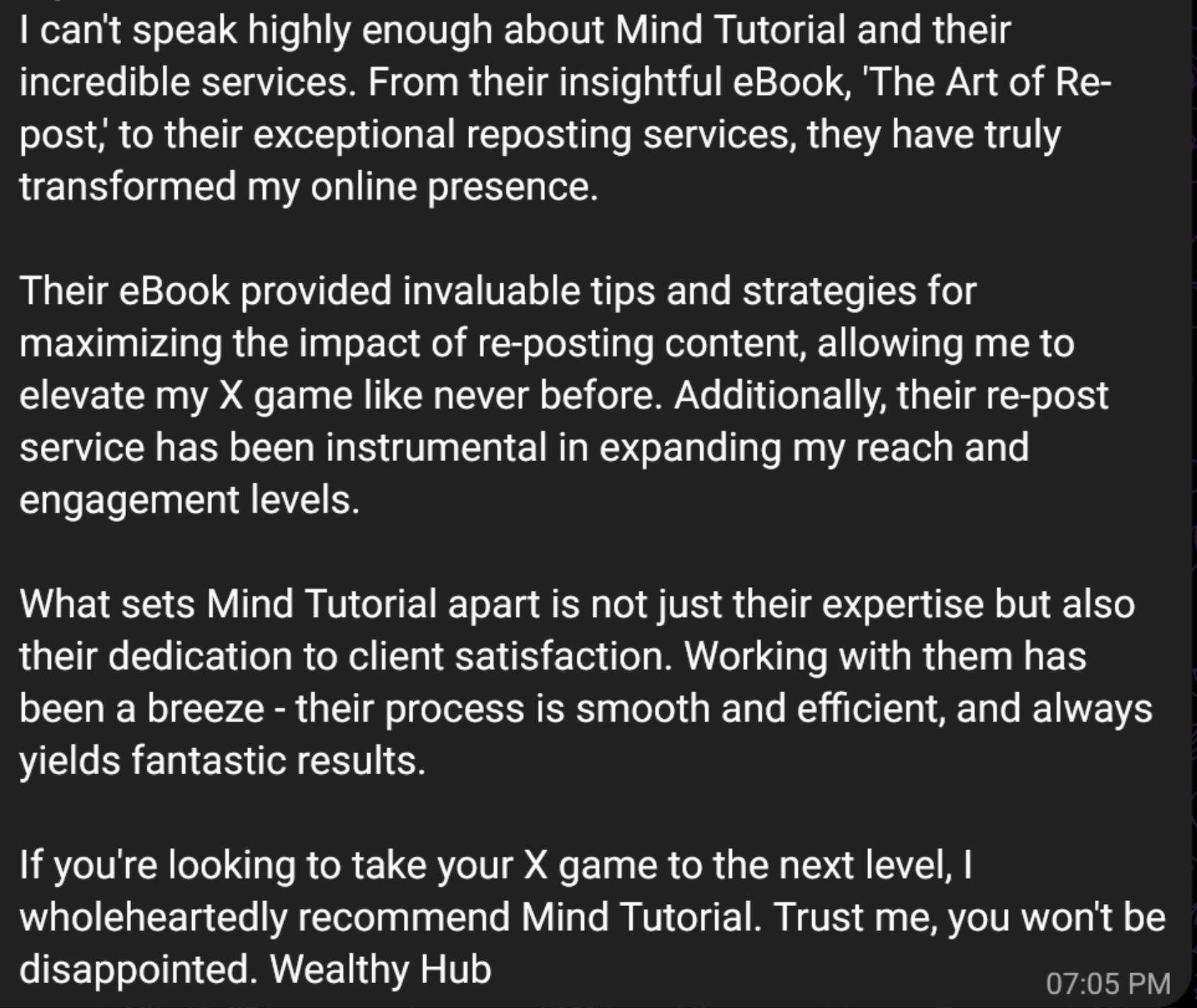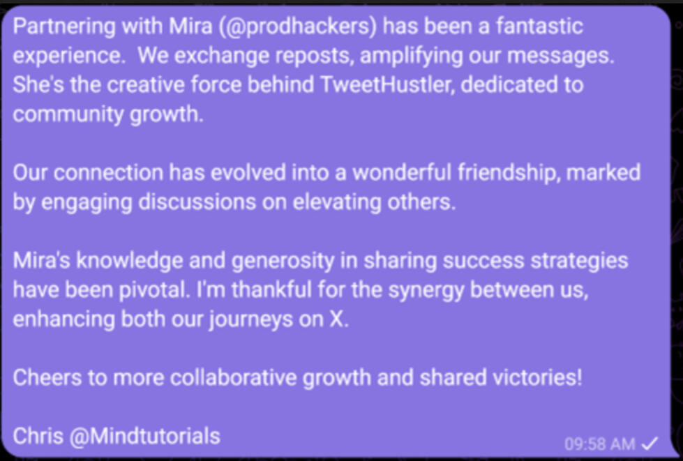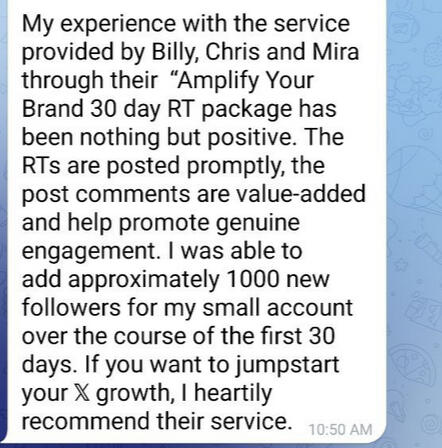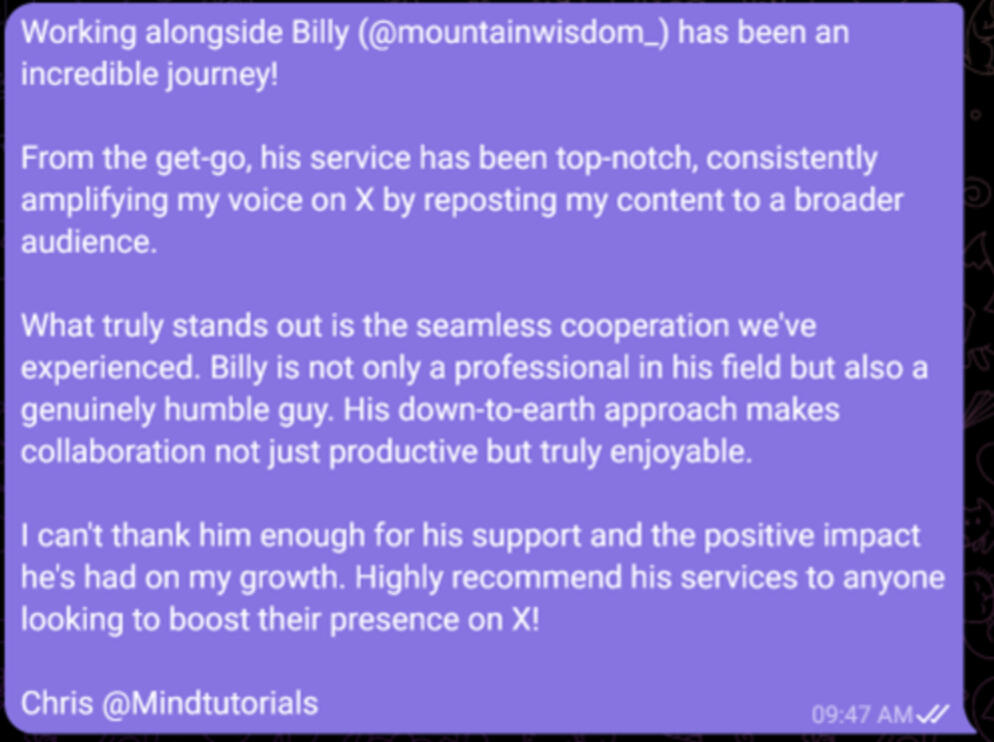 What will I learn from your service?You'll gain in-depth insights into leveraging π reposts for brand growth, including crafting repost-worthy content, engaging with influencers, and strategies for viral growth.Plus, real-life success stories and actionable tips from our personal experiences.